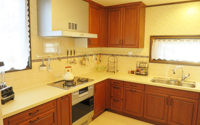 長さが7メートルを超える(2770mm+3055mm+1300mm)ボリューム感のある木製キッチンですが、独立したキッチンスペースに設置されており、とてもゆったりとした空間になっています。ご夫婦二人でキッチンに立っても十分に余裕があります。