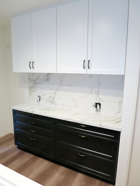 背面のカップボードです。長さは180cmでちょうど90cm幅のキャビネットが2列に並んでいます。セラミックトップの天板と壁面が中段になり、同じく幅90cmの吊戸棚が組み合わされています。